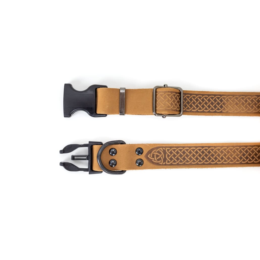 Show your sporty side with our Celtic Sport Khaki Leather Dog Collar! Your dog’s ready for action with this sleek, no-stitch design featuring bold Celtic Fire & Water Runes and all-black hardware. Equipped with ultra-strong Polyacetal YKK buckles crafted in Japan and made in the USA, this collar combines style and durability for every adventure.