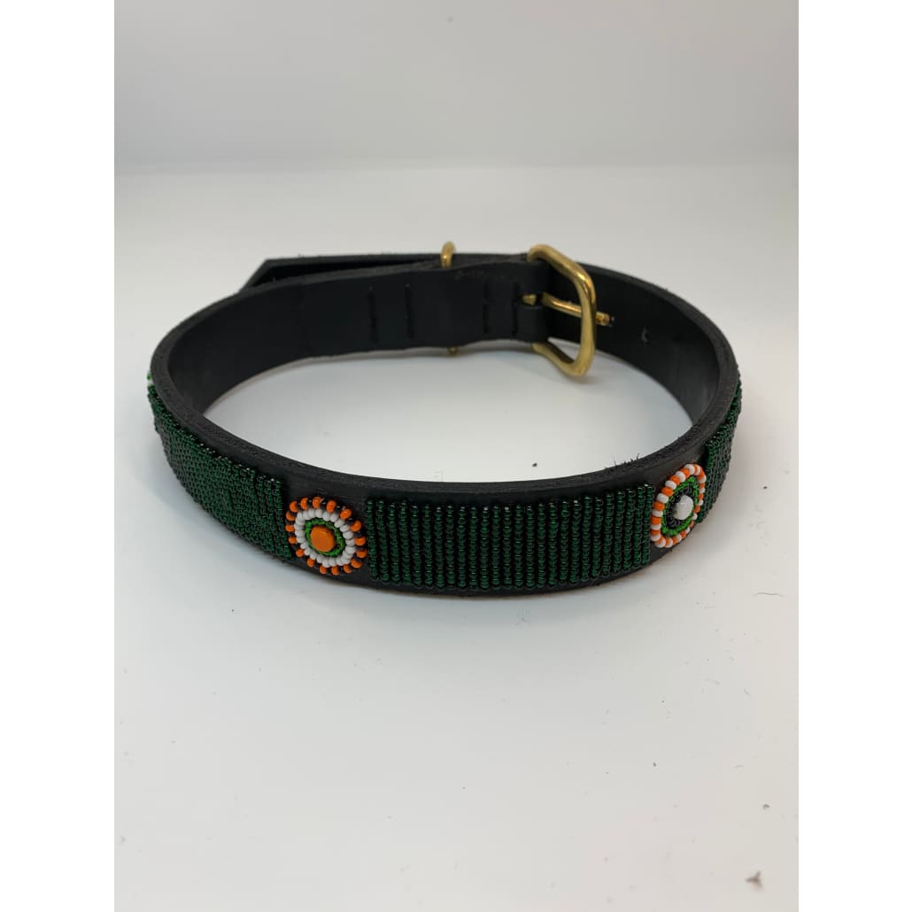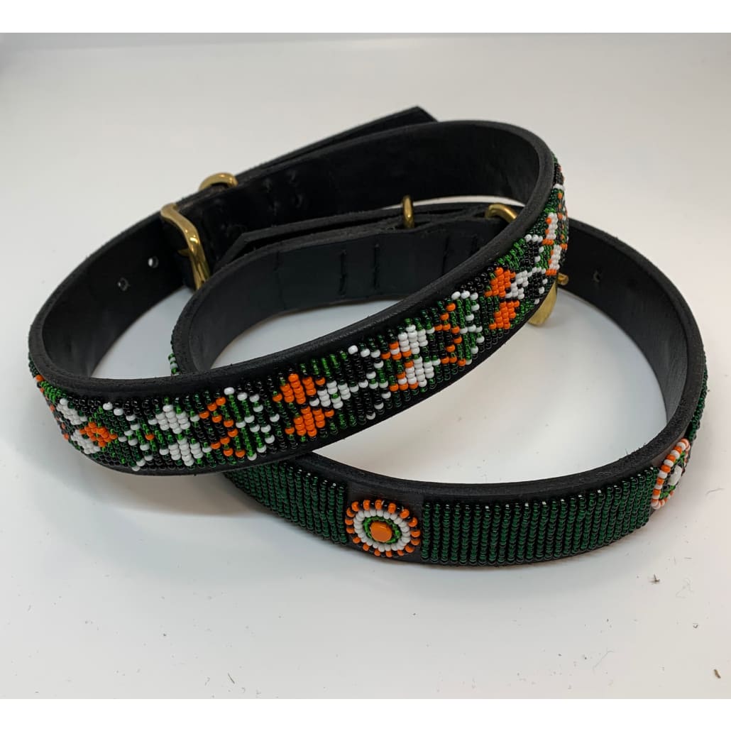 Circle of Life Collar: This collar showcases a bold pattern with solid green beads accented by vibrant circles in orange and white, creating a striking visual impact.