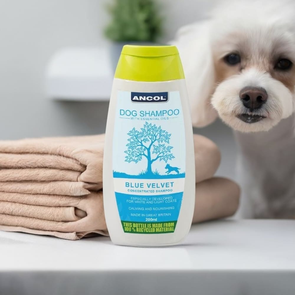Discover the power of Ancol's Blue Velvet shampoo, made with natural essential oils in a concentrated 200 ml formula for gentle, yet effective cleaning. Specifically designed for white and light coats, it's perfect for both dogs and puppies. Get up to 20 washes from each bottle. Made in the UK with pride. Try it today and see the difference it makes for yourself!