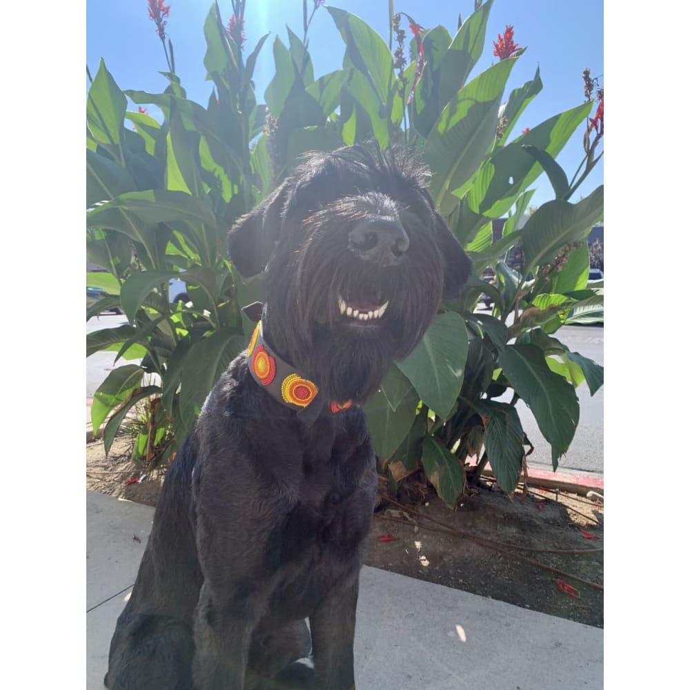 Introducing The Morocco Beaded Dog Collar: Featuring bright orange, yellow, and red beads arranged in eye-catching circles, this collar mirrors the radiant colors of the sky at dawn and dusk. Set against a rich leather base, it captures the warm, dynamic essence of these natural colors, making it a stunning and lively accessory for your dog.