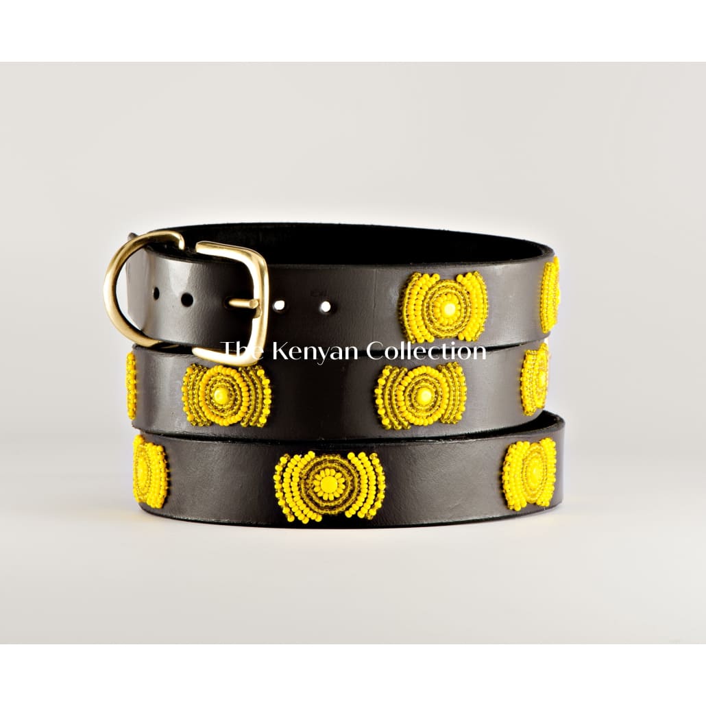 Each creation is meticulously handcrafted by skilled Maasai Mamas using premium, durable leather, with hand-cast buckles and clasps. Crafting one collar takes a Maasai Mama about a day, while a belt requires two days of dedicated beading. The beads are carefully hand-sewn onto the first layer of leather, followed by the addition of high-quality hardware and a second leather layer, which is glued and stitched for added softness and durability.
