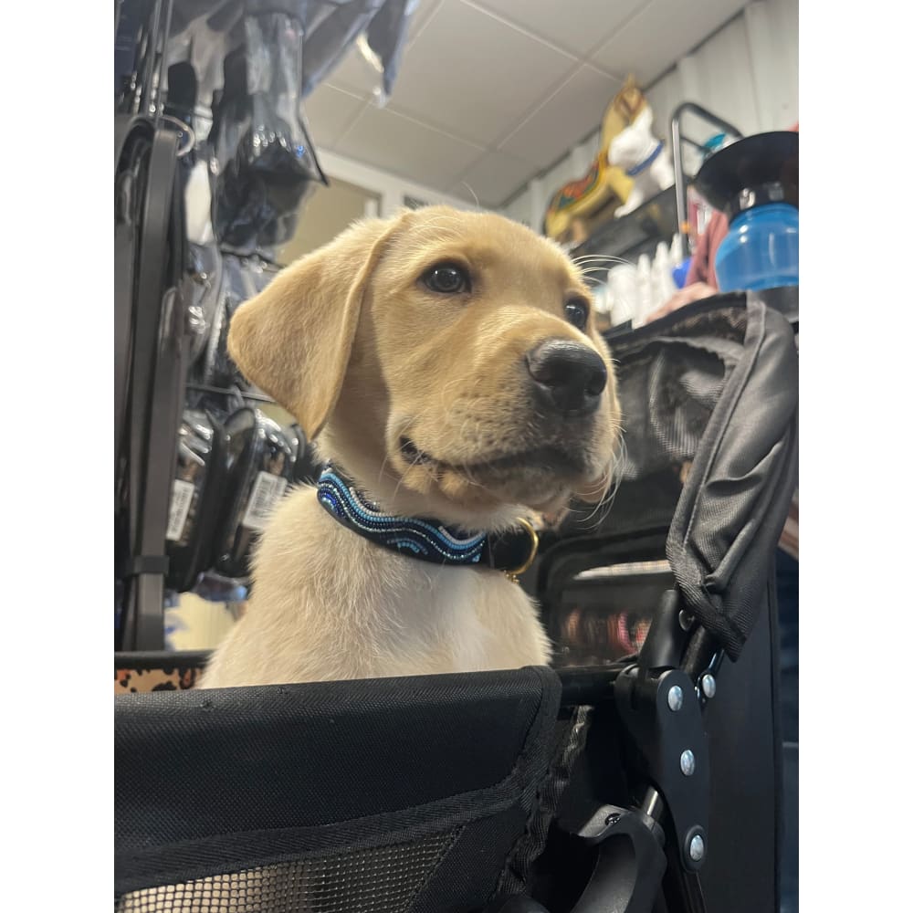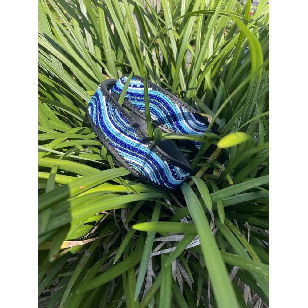 Introducing The Wave Beaded Dog Collar: Featuring varying shades of blue set against black leather, with beadwork that elegantly mimics the dynamic movement of ocean waves. Its design captures the essence of the sea, infusing a touch of coastal elegance into your dog's style.