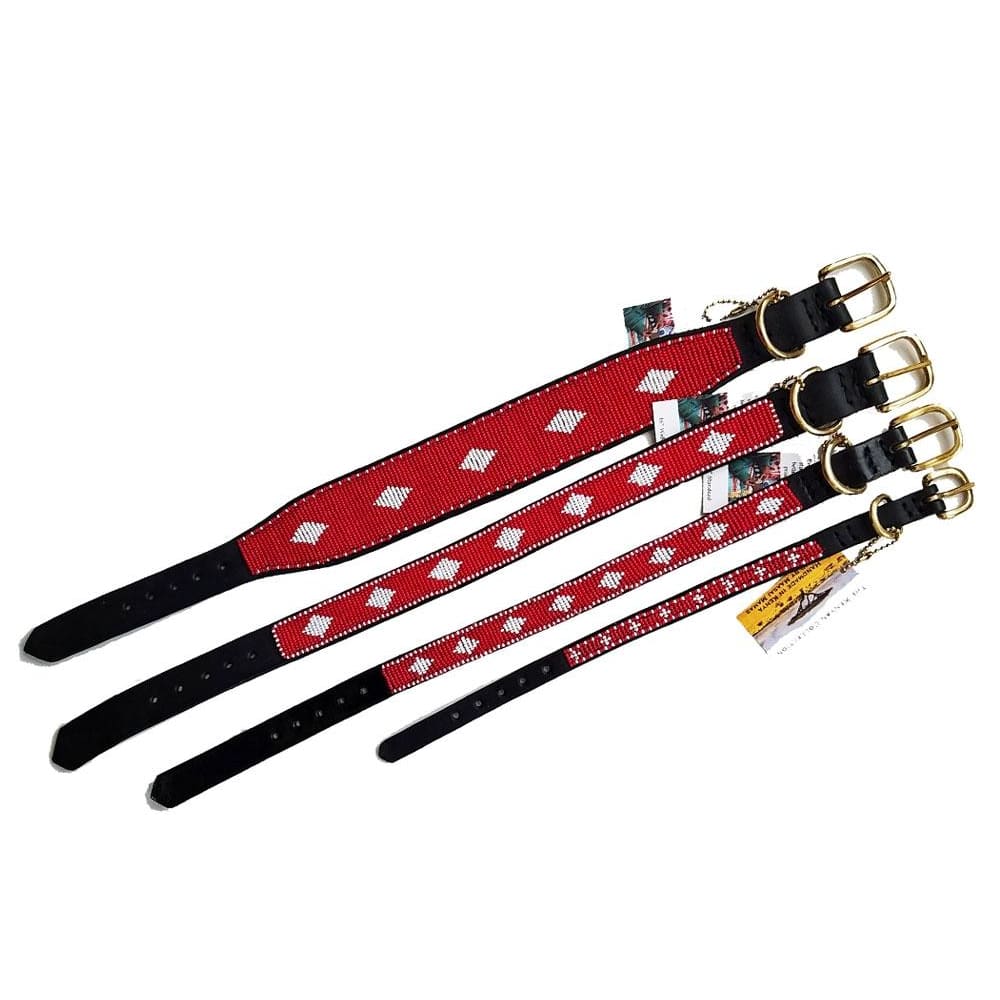 Introducing The Unity Beaded Dog Collar: featuring a vibrant red beaded background, adorned with striking white diamond patterns, all set against rich black leather. Handcrafted with exceptional artistry, the "Unity" collar beautifully blends bold colors and intricate design, reflecting the cultural richness of Kenya. It’s the perfect accessory to add a touch of elegance and individuality to your dog's ensemble. Complete the look with the Unity Beaded Dog Lead.
